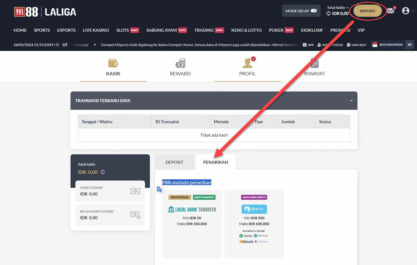 M88への入金を成功させるためには、まずM88アカウントにログインする必要があります。右上の「Login」ボタンをクリックして、ログイン画面がポップアップします。ログイン情報を入力してください。もしLink M88アカウントをお持ちでない場合は、「Register」をクリックして正確な情報で登録フォームを記入し、登録プロセスを完了させてください。登録が完了したら、M88オンラインアカウントにログインし、ホームページに移動します。M88 comのホームページの右上隅にある「Deposit」ボタンを探してクリックし、M88入金プロセスを開始します。